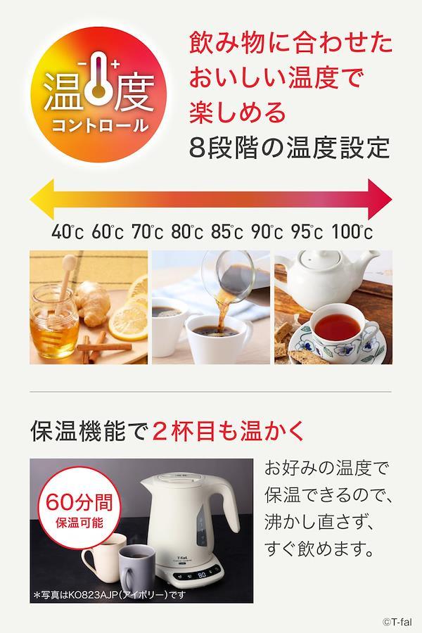 サイズ:幅21.5×奥行24.3×高さ24.1cm本体重量:1.357kgおいしさ引き出す8段階の温度設定 (40・60・70・80・85・90・95・100℃) / 好きな温度で60分間の保温可能倒れてもお湯がこぼれにくいロック機能付きケトル専用洗浄剤1包(15g)付きKO823NJPにケトル洗浄剤を同梱したオリジナルモデル