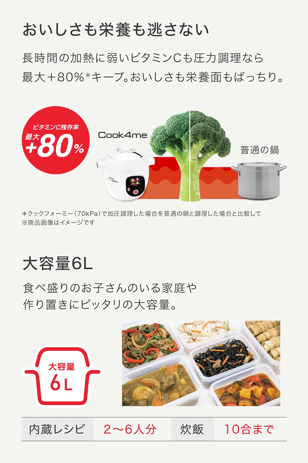 T-fal Electric Pressure Cooker, Waterless Cooking, Large Capacity, 6L, For 2-6 People, Built-in Recipe Type (150 Types), 4-in-1, Cook4me Express, Time-Saving, Convenient App, White, CY8511JP