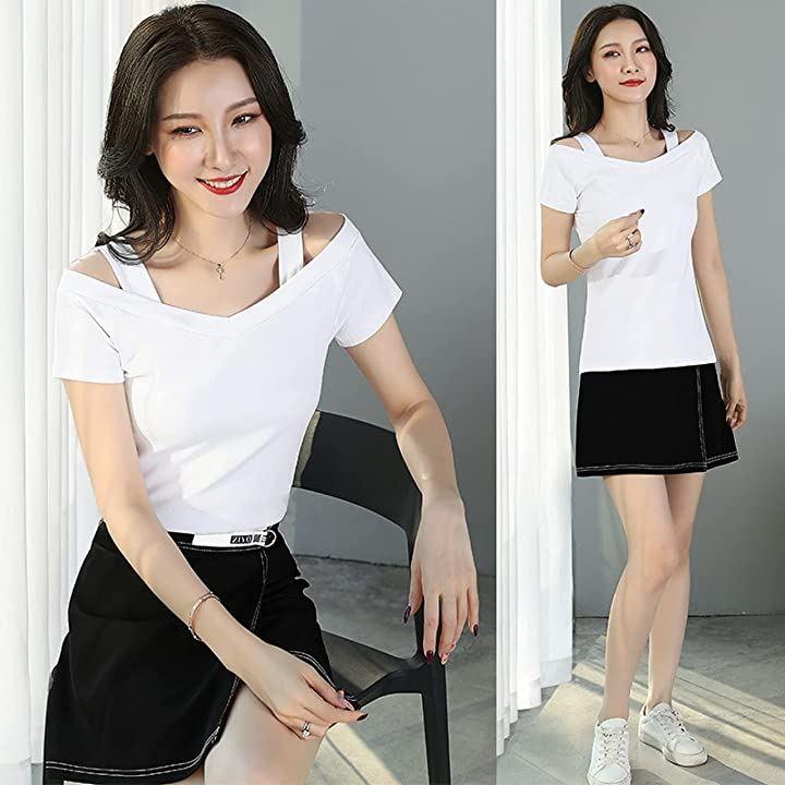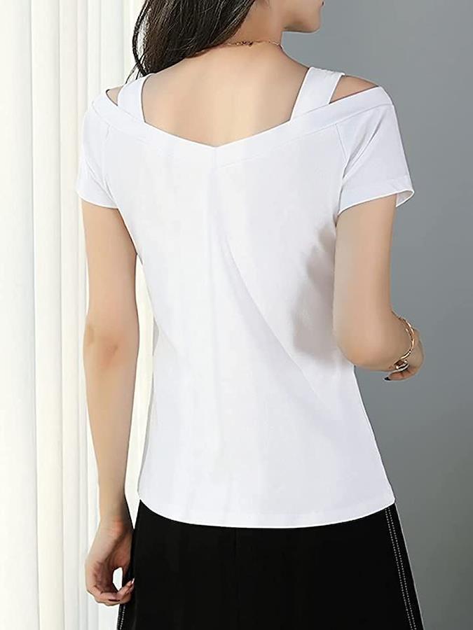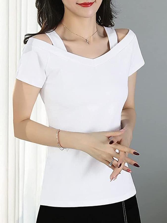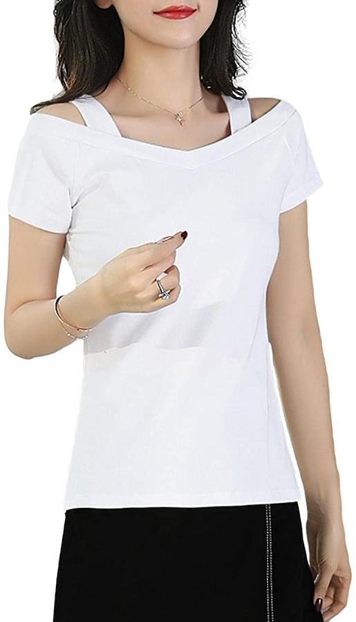 個性的なネックラインとオープンショルダーが特徴的なTシャツ。