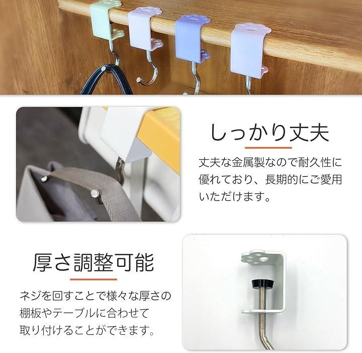「多用途で便利な収納フック」このテーブルフックは、カバンやバッグを掛けるだけでなく、帽子やコート、アクセサリー、ヘッドホンなど様々なアイテムを引っ掛けて整理整頓するのに最適です。