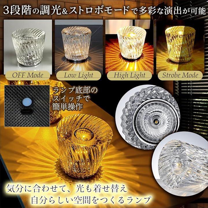 三段階の調光モードで柔軟な雰囲気作り このクリスタルランプは、3つの異なる調光モードを備えており、ランプの底部にあるスイッチで簡単に切り替え可能です。