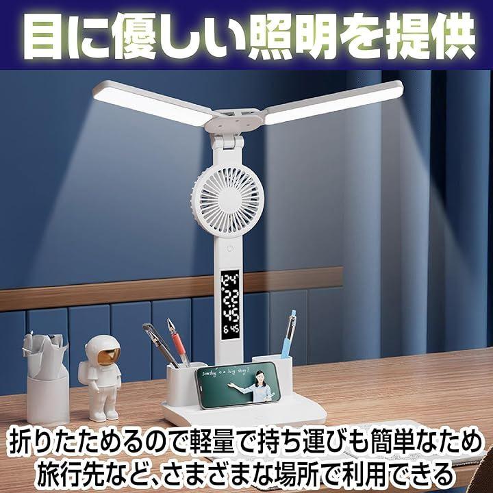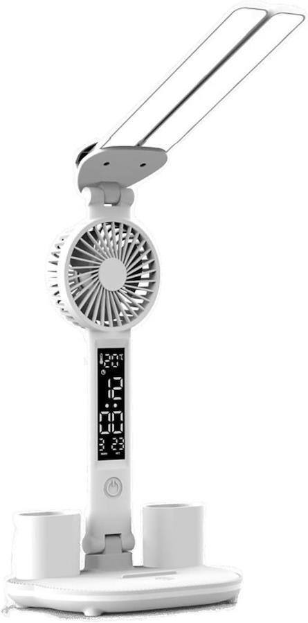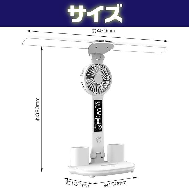 「多機能デザインで快適な作業空間を実現」 このテーブルランプは、LED照明、扇風機、ペンホルダー、時計、温度計、カレンダーなどの機能を一体化した多機能デザインです。