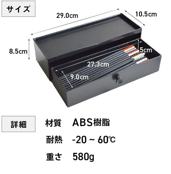 ・v「サイズ」箱外:幅 29.0 cm 奥行 10.5 cm 高さ 8.5 cm 箱内:幅 27.3 cm 奥行 9.0 cm 一般的な長さの箸は男性用 23cm 、女性用 21cm なので、十分に余裕を持って出し入れできます。