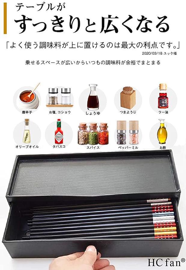 ・v調味料やつまようじなどが置ける、カスターと一体になった機能的な箸箱です。