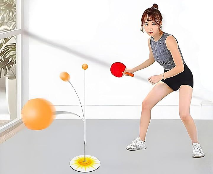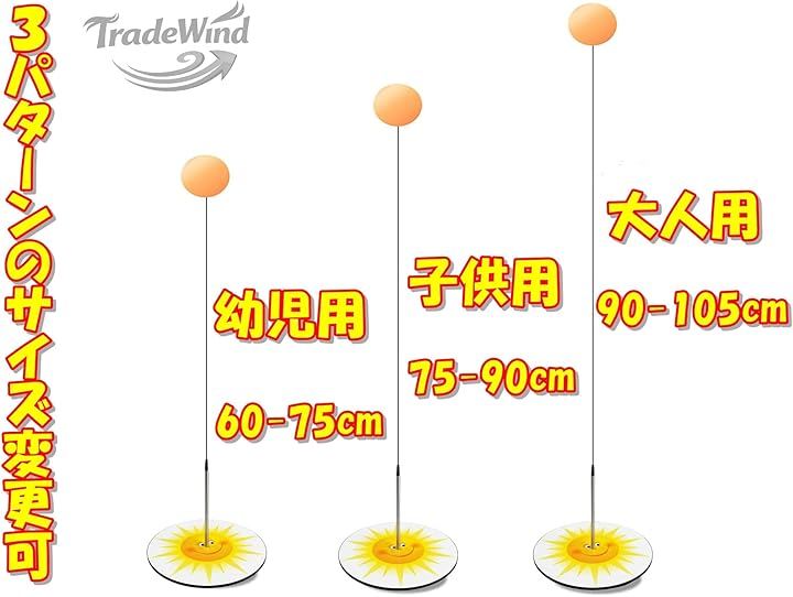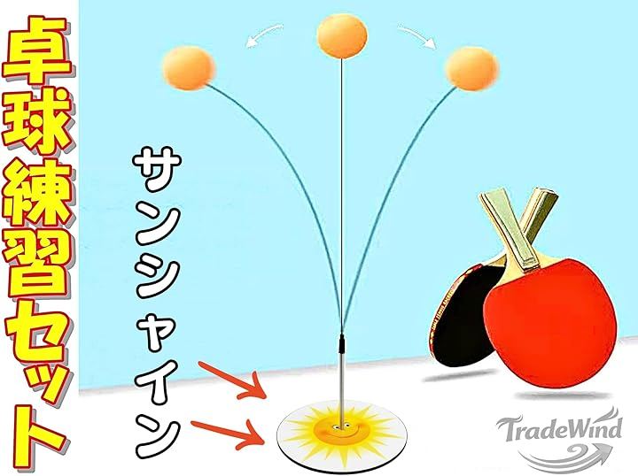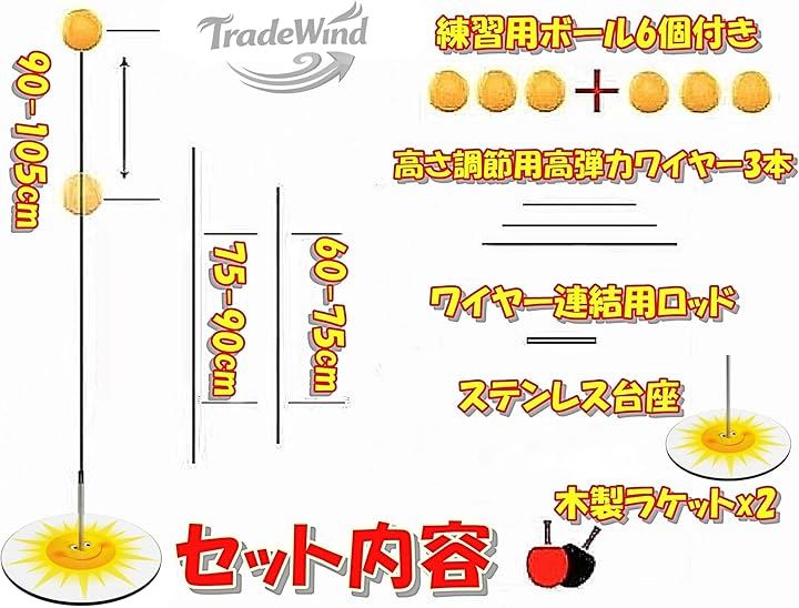 「セット内容&新デザイン」 木製ラケットx2、専用ピンポン球x6、高弾性ワイヤx3(60~105cm対応)、高さ調節器x1、新デザイン台座(サンシャイン)x1 台座部分は滑り止め加工付きで安定感抜群。