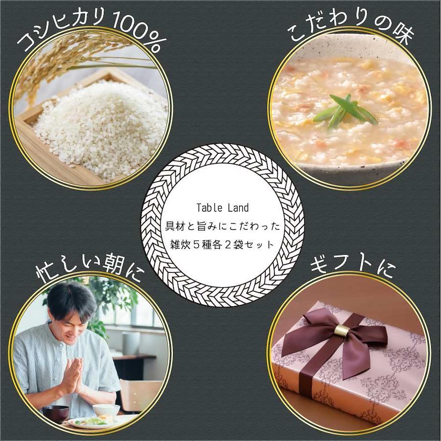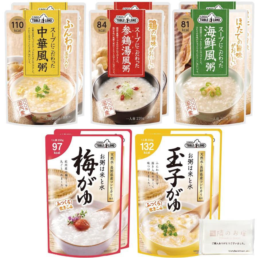 テーブルランド スープこだわったお粥 5種 各2袋 ・内容:スープにこだわった参鶏湯粥、スープにこだわった中華粥、スープにこだわった海鮮風粥、お粥は米と水 梅がゆ、お粥は米と水 玉子がゆ 各2袋 ・隣のティッシュセット