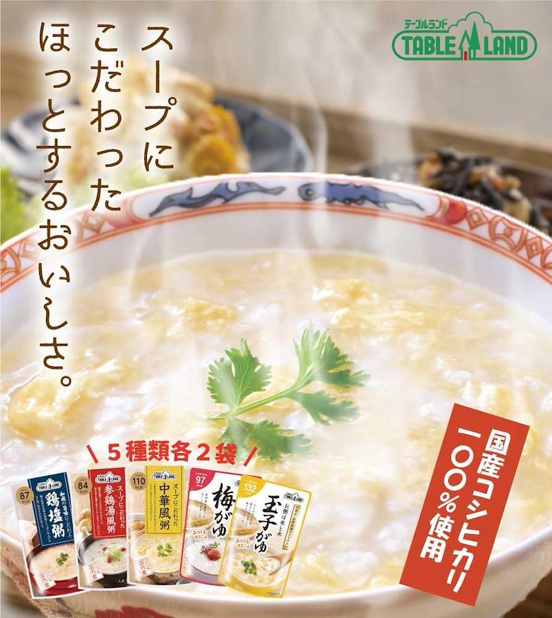 テーブルランド スープこだわったお粥 5種 各2袋内容:スープにこだわった参鶏湯粥、スープにこだわった中華粥、スープにこだわった海鮮風粥、お粥は米と水 梅がゆ、お粥は米と水 玉子がゆ 各2袋隣のティッシュセット【重要】メーカーによる商品リニューアルに伴いパッケージ(内容量も含む)変更が行われた場合、新パッケージでお届け致します事ご了承願います。