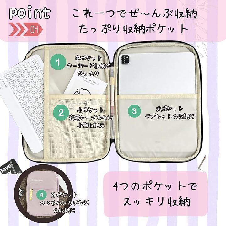 内側にはメッシュポケットやペン差しがあり、充電器やキーボードなどの付属品もすっきり収納できます。
