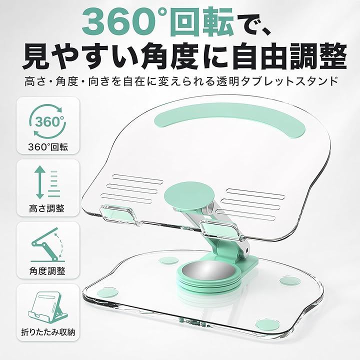 Tablet Stand, 360° Rotation, Adjustable Height and Angle, Desktop, Transparent, Clear, Portable, Foldable, Lightweight, Non-Slip, Charging, Smartphone