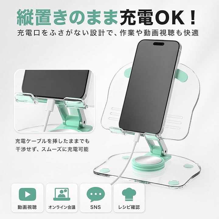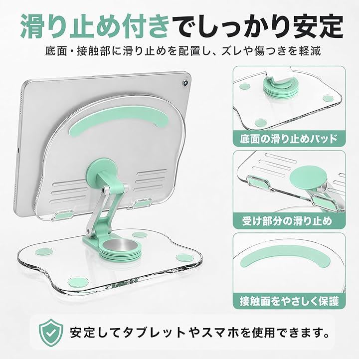 安定感のある透明ベースに滑り止めを搭載し、スマホやタブレットなど幅広く対応。