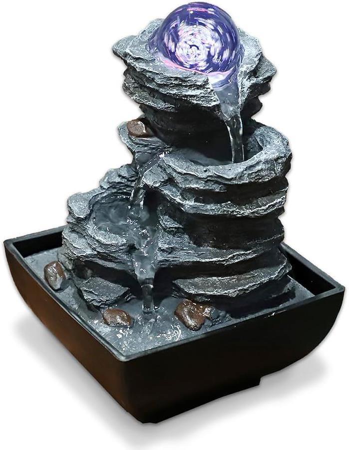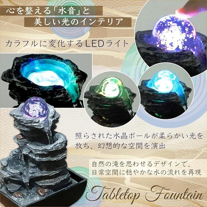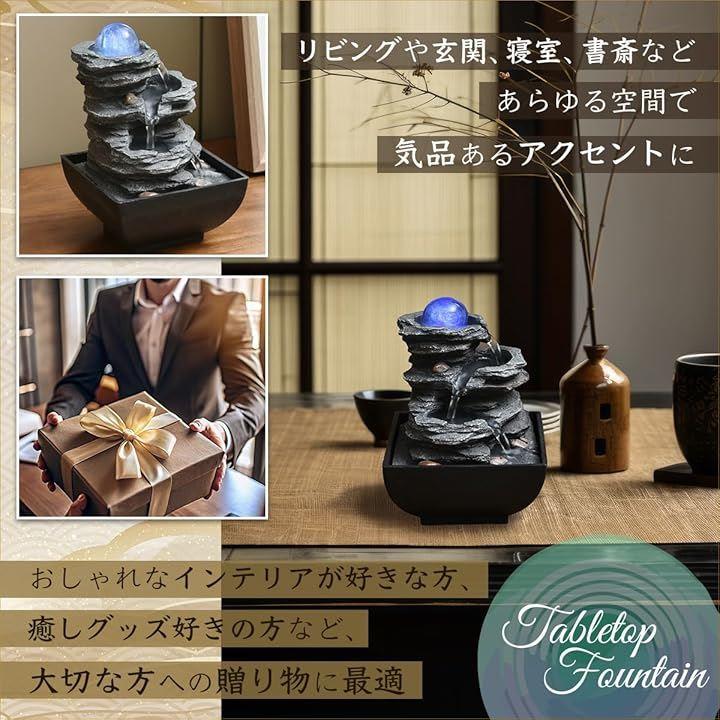 「幻想的な光と水の癒し空間を演出する卓上噴水」 この卓上噴水は、美しい天然石風の樹脂製ボディと、LEDライトに照らされた水晶ボールが織りなす幻想的な光景で、お部屋の雰囲気を一気に格上げします。