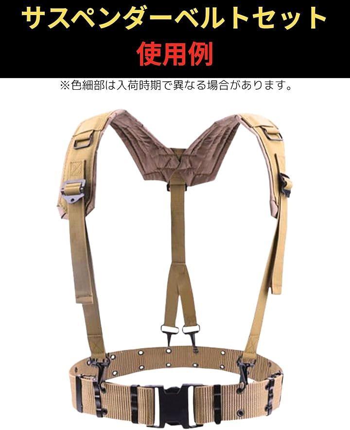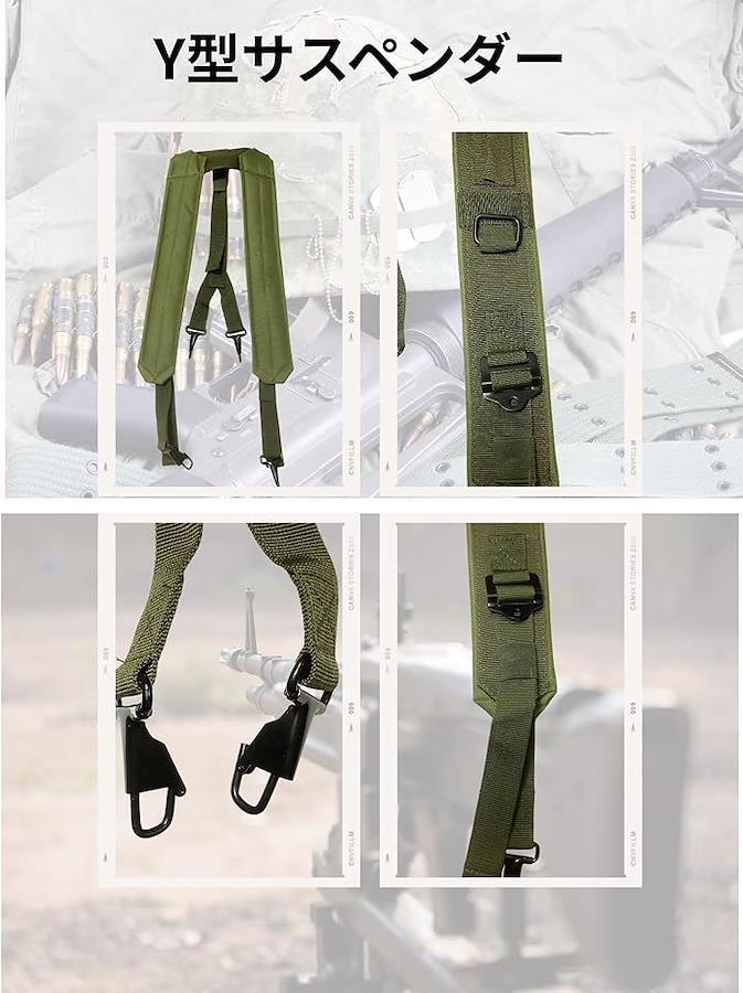 サスペンダーについて「腰装備を快適にサポートするY型サスペンダー構造」本商品は、米軍仕様を踏襲したY字型サスペンダーで、ピストルベルトやタクティカルベルトに対応した設計です。