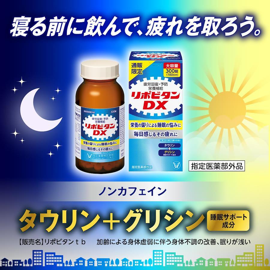 疲労回復・予防・栄養補給に毎日感じるその疲れに1日1回3錠で効く●リポビタンDXは、日常的な疲れのケアや予防のために、新しい「錠剤タイプのリポビタン」です。●エナジーサイクルに働きかけるタウリンやビタミンB1・B2・B6をはじめ合計9種類の有効成分が、からだ全体の疲れを回復に導きます。●小さくて飲みやすい錠剤です。●ノンカフェインでお休み前にも服用していただけます。 "商品サイズ (幅×奥行×高さ) :60mm×62mm×126mm 内容量:300錠" 年齢を重ねて感じる睡眠の悩み(寝付きの悪さ、眠りの浅さ、目覚めの悪さ)の改善に "効能・効果 ★疲労の回復・予防 ★日常生活における栄養不良に伴う身体不調の改善・予防:疲れやすい・疲れが残る・体力がない・身体が重い・身体がだるい、肩・首・腰又は膝の不調、二日酔いに伴う食欲の低下・だるさ、寝付きが悪い・眠りが浅い・目覚めが悪い、肌の不調(肌荒れ、肌の乾燥) ★体力、身体抵抗力又は集中力の維持・改善 ★虚弱体質(加齢による身体虚弱を含む。)に伴う身体不調の改善・予防:疲れやすい・疲れが残る・体力がない・身体が重い・身体がだるい、肩・首・腰又は膝の不調、寝付きが悪い・眠りが浅い・目覚めが悪い、肌の不調(肌荒れ、肌の乾燥) ★病中病後の体力低下時、発熱を伴う消耗性疾患時、食欲不振時、妊娠授乳期又は産前産後等の栄養補給 用法・用量 次の量を水又はぬるま湯で服用してください。 15才以上:1回3錠 1日1回 15才未満:服用しないこと" "成分 3錠中 タウリン 500mg チアミン硝化物(ビタミンB1) 10mg リボフラビン(ビタミンB2) 5mg ピリドキシン塩酸塩(ビタミンB6) 5mg アスコルビン酸カルシウム 100mg(ビタミンCとして 82.6mg) カルニチン塩化物 10mg グリシン 5mg サンヤク末 10mg シゴカ乾燥エキス 8mg(シゴカ200mg に相当) 添加物:無水ケイ酸、セルロース、ヒドロキシプロピルセルロース、ステアリン酸Mg、タルク、マクロゴール、酸化チタン、ヒプロメロース、三二酸化鉄、カルナウバロウ" 【特徴①】日々の疲れのケアや予防のための、「錠剤タイプのリポビタン」です。 【特徴②】タウリンやビタミンB1・B2・B6に加えて、睡眠サポート成分のグリシンやシゴカを配合。 【特徴③】年齢を重ねて感じる睡眠の悩み(寝付きの悪さ、眠りの浅さ、目覚めの悪さ)の改善にも。