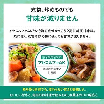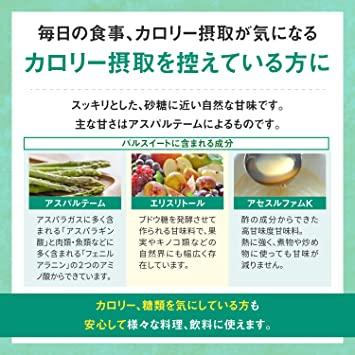 【原材料名】エリスリトール、発酵調味料/甘味料(アセスルファムK、アスパルテーム・L-フェニルアラニン化合物、スクラロース、アドバンテーム)、増粘剤(キサンタンガム)、酸味料、保存料(安息香酸Na)、乳酸Ca