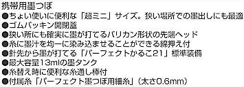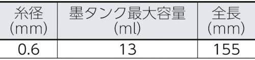 糸の長さ:30m墨タンク容量:13ml付属糸太さ:0.6mmちょい使いに便利なミニサイズゴムパッキン開閉蓋付き狭い所にも墨が打てるバリカン形状の先端ヘッド仕様糸に墨汁を均一に染み込ませることができる綿押え付き
