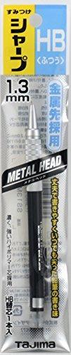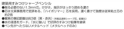 ●定評のある「ハイポリマー」芯を採用しています。●【用途】●建築用すみつけシャープペン。●【機能・特徴】●削る必要のない1.3mm芯でけがき、指示がはっきり読める濃さです。●芯は文具事務用で定評ある、「ハイポリマー」芯を採用し、濃く書けて強度は従来粘土芯の約2倍です。●驚異の筆記距離は約3倍です(市販品通常シャープ芯、鉛筆比)。●ペン先がへたらないメタルヘッド仕様です。●【仕様】●芯の太さ:1.3mm。●メタルヘッド。●製品重量:15G。●【材質】●芯:黒鉛。●外装:ABS樹脂。●【商品サイズ】幅12×高さ143×奥行8mm 重量15g●商品コード:4975364067548●JANコード:4975364067548●ブランド名:タジマ●商品名:すみつけシャープメタルH●規格:SS13MH-HB●【注意事項ほか】●筆記以外には使用しないでください。先端が尖っているので注意してください。