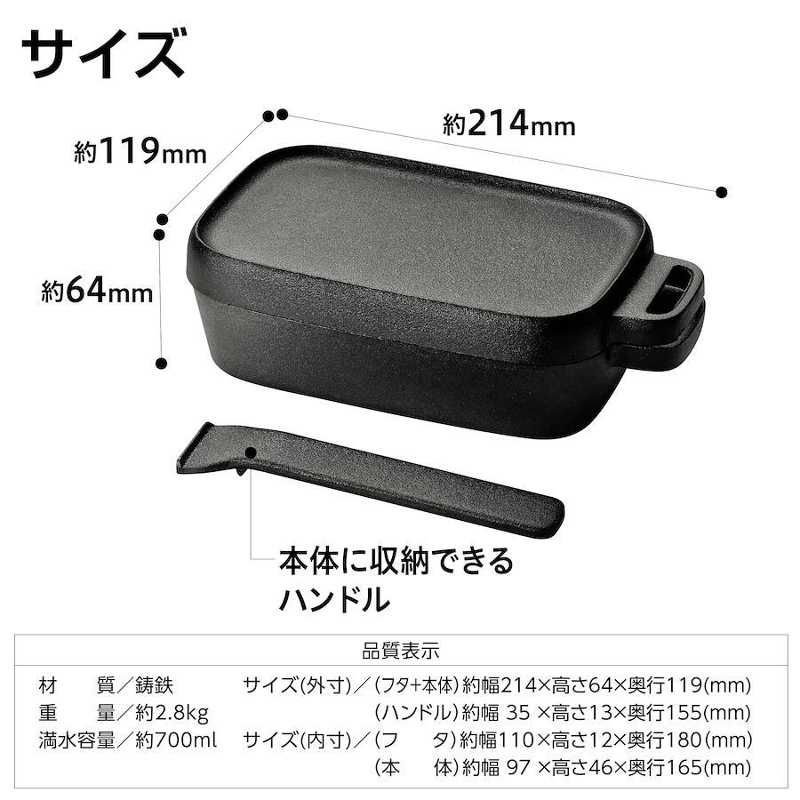 【鋳鉄】高い蓄熱性・保温性でもっと美味しいキャンプ飯セット内容:本体×1、フタ×1、ハンドル×1、取扱説明書×1材質:鋳鉄、重量:約2.8kg、満水容量:約700mlサイズ外寸:(フタ+本体)約幅214×高さ64×奥行119mm、(ハンドル)約幅35×高さ13×奥行155mm/サイズ内寸:(フタ)約幅110×高さ12×奥行180mm、(本体)約幅97×高さ46×奥行165mm製造国:中国