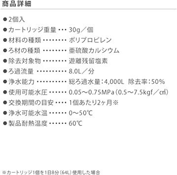 材料の種類:ポリプロピレン除去対象物:遊離残留塩素ろ過流量:8.0L/分浄水能力:総ろ過水量 4,000L 除去率50%使用可能水圧:0.05~0.75MPa