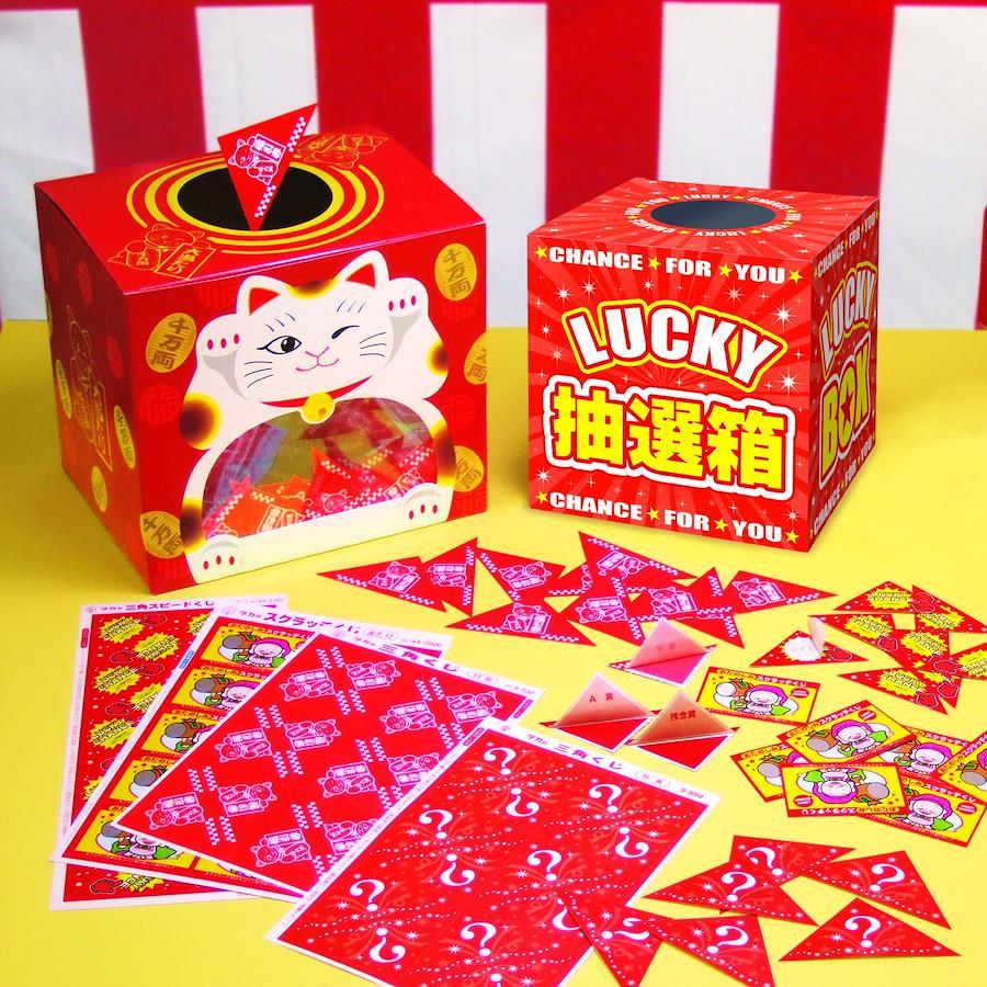 取り出し口も大人の手が余裕をもって入る大きさですので、中身のオリジナル性も高く、三角くじはもちろんお菓子などもOK!