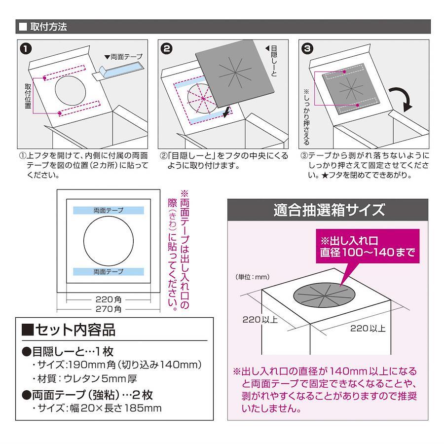 両面テープで貼り付けるだけで簡単に目隠し付抽選箱に早変わりします!スポンジシートが蓋の代わりにもなり、抽選箱をかき混ぜても中身のくじが飛び出る事がありません!三角くじ以外でも、目隠しをつける事によってカラーボール・ビンゴ・カード式のくじ等、