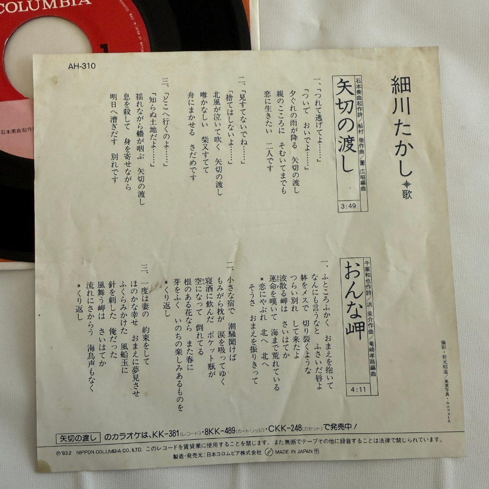 Takashi Hosokawa Showa Era Vintage EP Record Yagiri no Watashi Onna Misaki 7-inch Extended Play