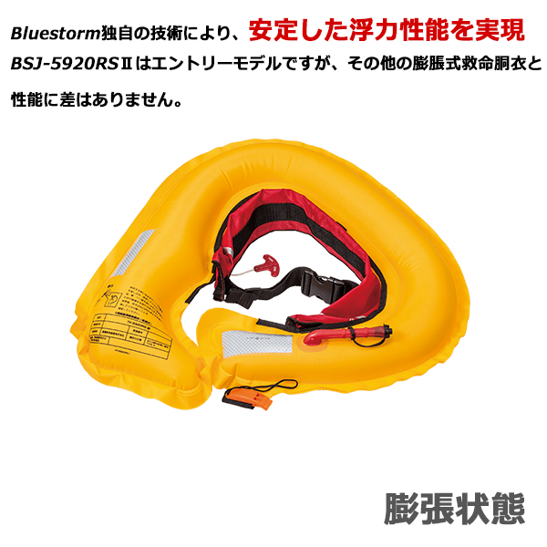 BSJ-5920RS2はエントリーモデル・ウエストタイプの膨脹式ライフジャケットです。Bluestormウエストシリーズの中でも最も細い形状です。体に触れる面積を減らした事により、夏は涼しく長時間の着用を容易にします。また、ロッドワークも快適で長時間のアクションも続けることができます。国土交通省型式承認Type Aを取得しています。 SIZE:胴囲70~100cm 生地:ポリエステル420D 重量:約430g 浮力:初期浮力 約9kg ※掲載している商品の画像は代表画像を表示しています。また実物と色が違って見える場合があります。あらかじめご了承下さい。