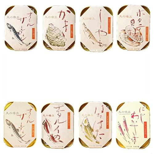 天の橋立 8種各1缶セット【オイルサーディン(真イワシ) 105g 1缶】 【オイルサーディン(片口イワシ) 105g 1缶】 【はたはた油づけ 105g 1缶】 【にじわかさぎ油づけ 95g 1缶】 【子持ちししゃも油づけ 105g 1缶】 【ほたるいかくん製油漬 95g 1缶】 【かき燻製油づけ 105g 1缶】 【ホタテ貝柱燻製油づけ 105g 1缶】【重要】メーカーによる商品リニューアルに伴いパッケージ(内容量も含む)変更が行われた場合、新パッケージでお届け致します事ご了承願います。