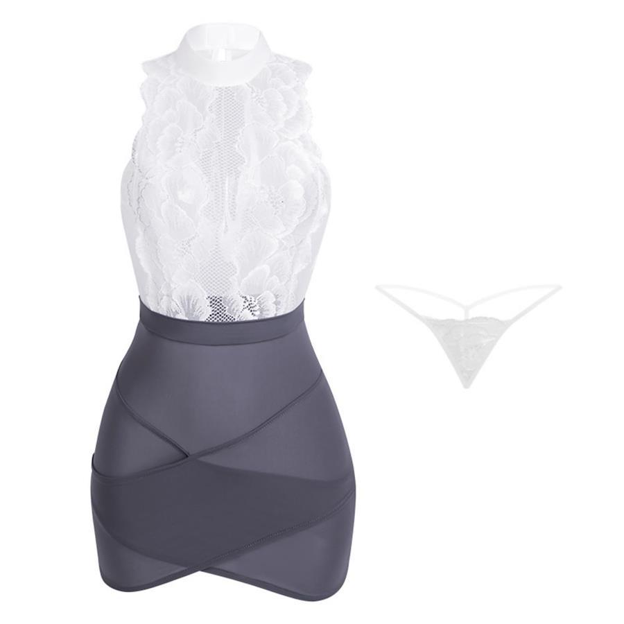 気質グレーと白の色の衝突秘書のドレス、胸絶妙なレースパターンパッケージは、セクシーな中空、視覚的な鈍い感じを破る、ファッショナブルな掘り肩、ショー魅力的な肩、ハイウエストスプライシング、弾性パッケージヒップ、不規則なクロスカットの前身頃、滑らかな生地は、セクシーなTパンツの内側に、ボディ形状に近い!