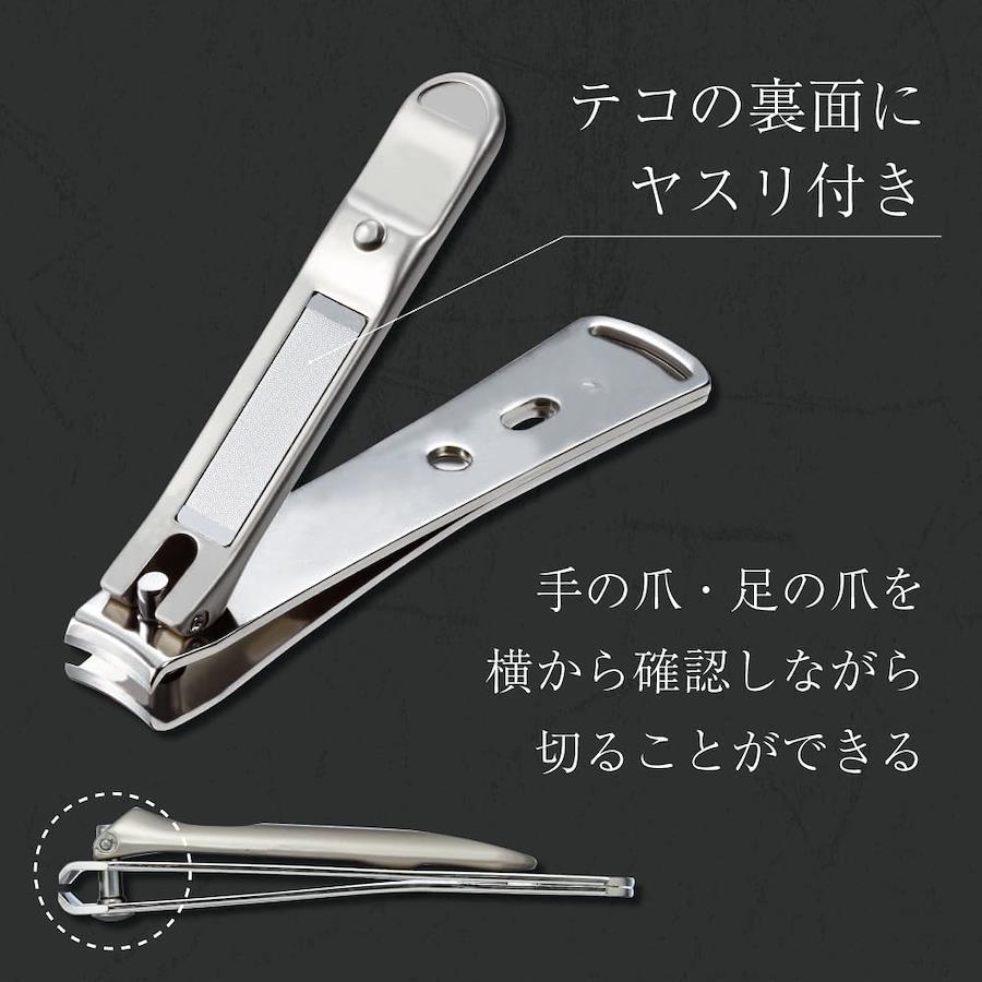 商品紹介●硬い爪も良く切れる、足の爪にも最適!●刃は厳選したステンレス刃物鋼を使用し、高硬度焼入れと二度刃付け技術により鋭利性と耐久性に優れています。●熟練の職人による最終仕上げの研磨と調整によって、優れた切れ味が持続します。●つめきり後にテコの裏面に付いている微粒ツメヤスリで整えると、よりなめらかに仕上げることができます。使用上の注意・刃は精密に仕上げています。爪以外