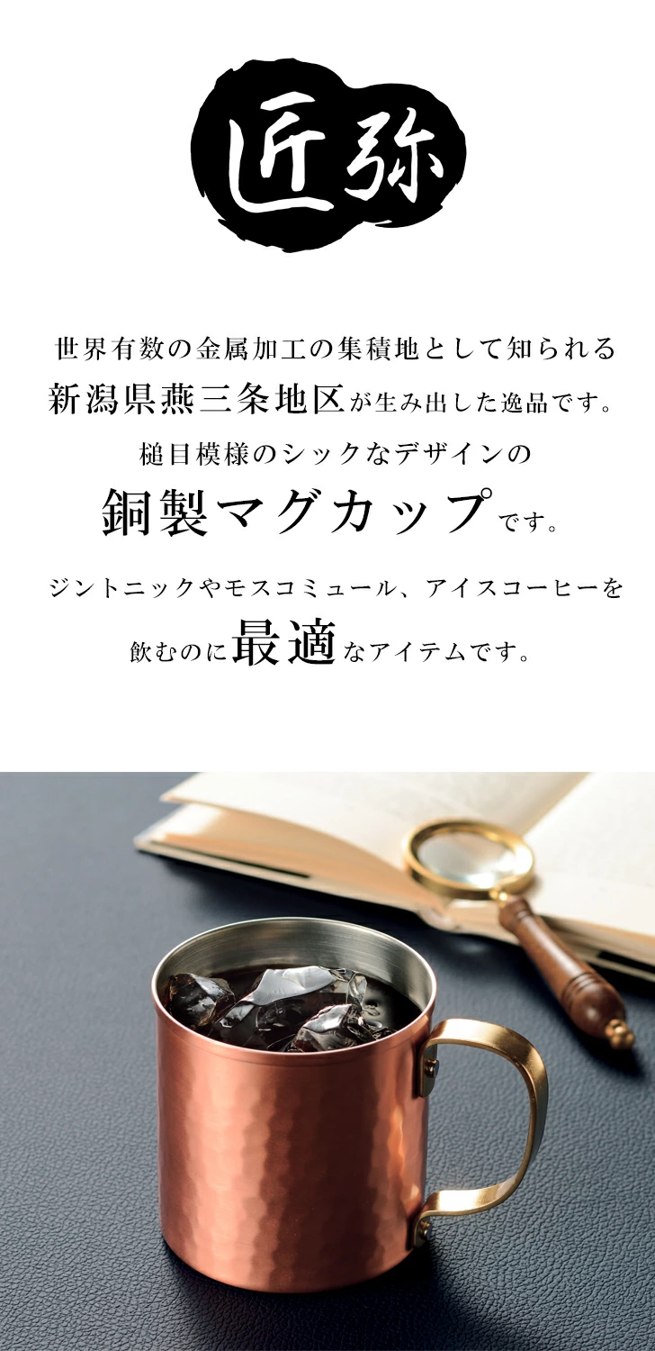 世界有数の金属加工の集積地として知られる新潟県燕三条地区が生み出した逸品です。槌目模様のシックなデザインの銅製マグカップです。ジントニックやモスコミュール、アイスコーヒーを飲むのに最適なアイテムです。