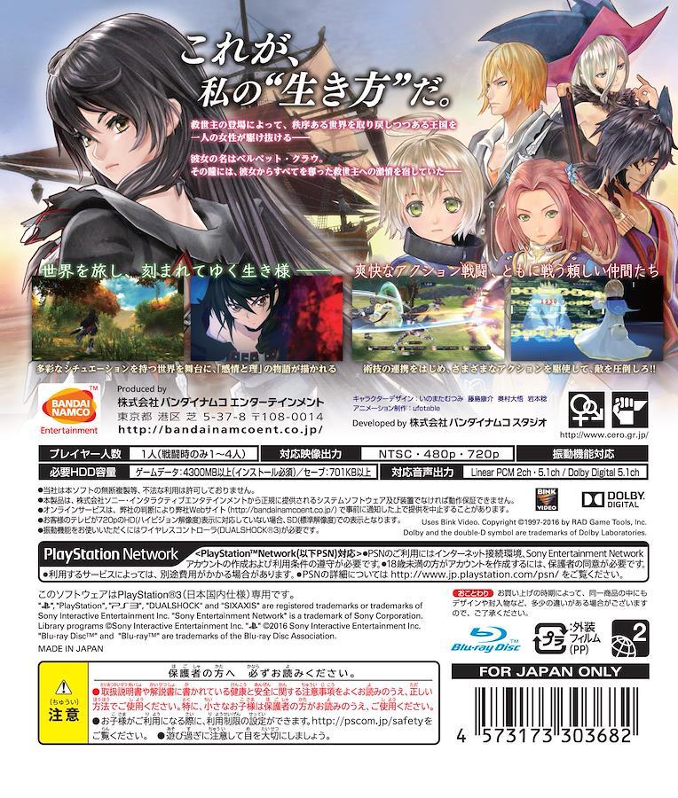 物語のテーマは「感情と理(ことわり)」。シリーズ初の単独女性主人公となるベルベットの復讐と、彼女をとりまく壮大な世界観の中で、重厚なストーリーが描かれる。Liberation-LMBS(リべレーション リニアモーションバトルシステム):シリーズで養ってきた戦闘の魅力を継承しつつも、カメラやキャラクター操作にあった制限を“解放(Liberation)”することでより自由度の高い操作性と術技連携が可能に。フリーランベースのキャラクター操作、自由なカメラを操作、術技を〇×△□の4つのボタンに割り振ることで自由自在な攻撃連携が可能に。バトルが苦手な人でもワンボタンで楽しめ、バトルが得意な人はバトルを優位に持ち込む為の戦略を組み楽しむことが出来る。ufotableによる美麗なアニメーションも収録。