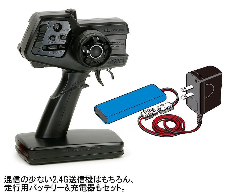 完成車体はもちろん、車のコントロールに最適なホイールトリガータイプの送信機、走行用7.2Vバッテリー、充電器もセットしました。RCメカはクリスタル交換など、バンド調整の必要がなく、気軽に複数台で楽しめる2.4GHzプロポセットを採用。【免責事項】メーカーによる商品リニューアルに伴いパッケージが変更が行われた場合、新パッケージでお届け致します事ご了承願います。