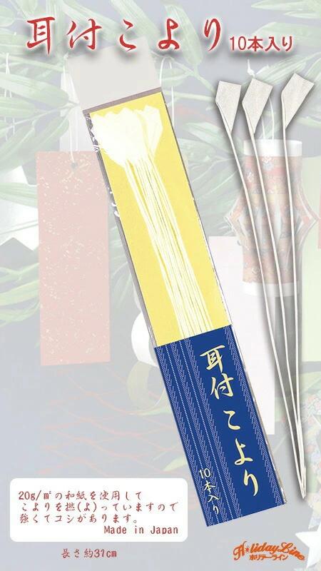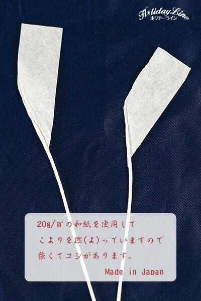 主に七夕飾りの短冊などを笹にくくりつける「こより」です短冊の穴に通すだけで簡単に飾ることができます!和紙で「こより」を撚(よ)っており、強くてコシがあります!お子様からシニアまで幅広いニーズに対応ご家庭、幼稚園、保育園、学校、会社、店舗、施設などに!★七夕飾り(耳付こより10本入)