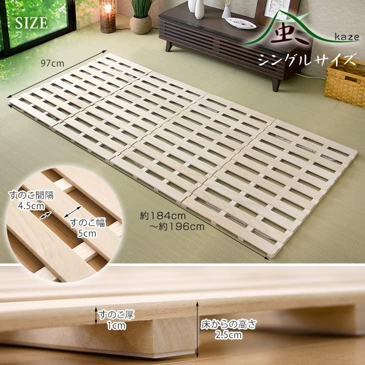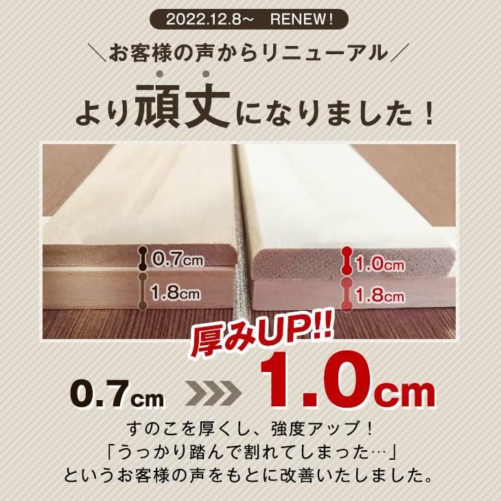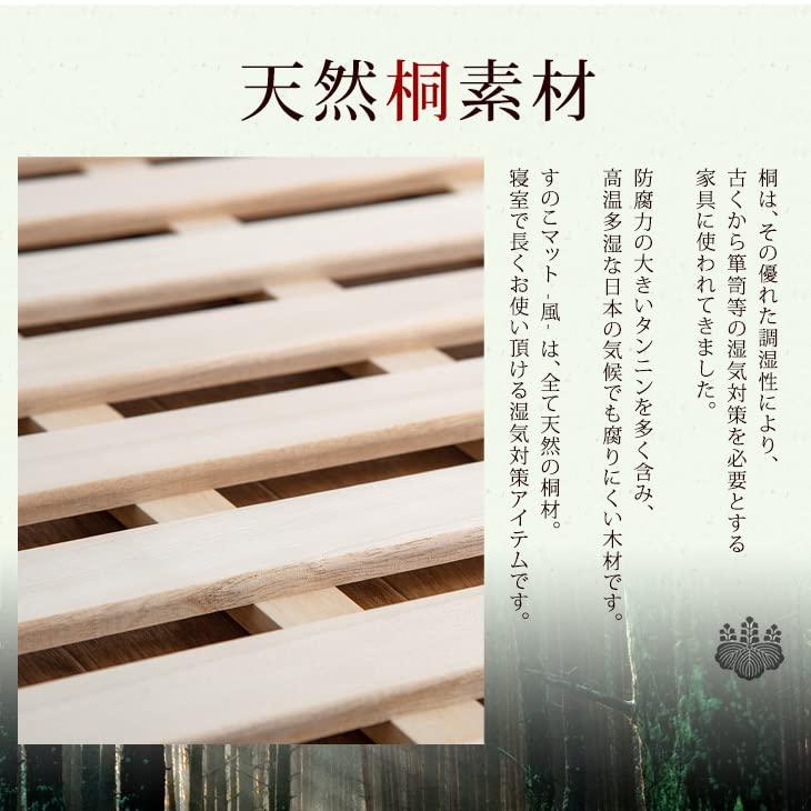 【サイズ】外寸:幅97×長さ184~196×高さ2.5cm / (シングルサイズ) / すのこ厚:1.0cm / すのこ幅:5.0cm / すのこ間隔:4.5cm 【素材】天然桐材 / キズ防止クッション材:EVA 【重量】約4.5kg 【梱包サイズ】12×49×99cm 【生産国】中国(ISO9001認定工場で生産)【完成品】 ※敷いたまま無理に引きずると床に傷がつく恐れがありますので、ご注意ください。※すのこの上に立つ場合はさん木の上に足をかけるなど強度の弱い部分に体重がかからないようにご注意ください。 ※飛び跳ねたり、一点に荷重をかけたりすると割れる恐れがあります。 ※固綿入りの厚手の敷布団や、マットレスでの使用を奨励しています。 ※1カ所に力が加わるようなご使用で破損した場合、取扱い説明書の注意をお守り頂いていない場合などは、返品・交換の対象外となりますので、予めご了承ください。 ※2022年12月8日にすのこの厚み、サイズの仕様を一部変更しました。 【スタッフのおすすめポイント!】 ・長さは184~196cmまで調節可能 ・国内の第3者機関にて、性能試験を実施 ・布団を湿気・結露から守るすのこマット ・お子様にも安心の低ホルムアルデヒド仕様 ・四つ折りにして布団干しも楽に! ・折りたたみ固定は簡単マジックテープ式 ・キズ防止クッション付き