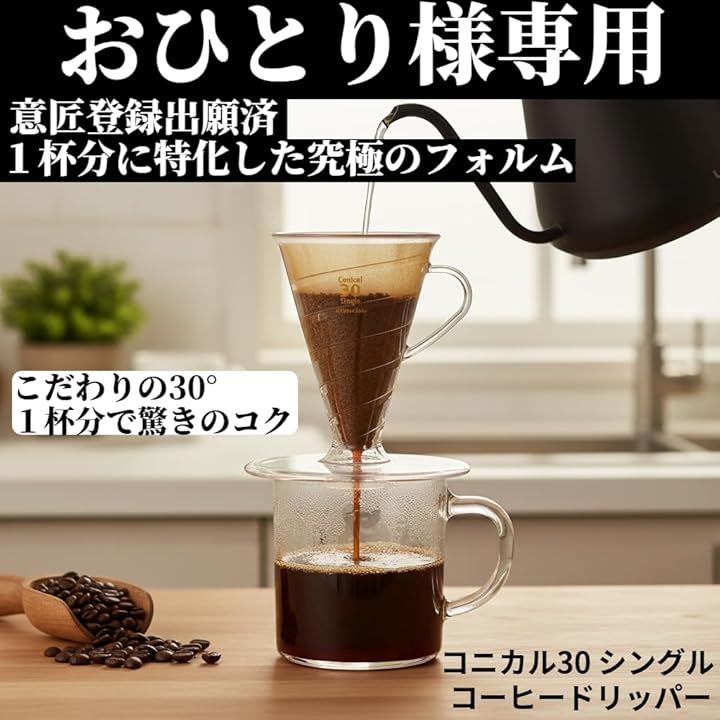 「こだわりの30°」 この30°という角度によりドリッパー内のコーヒー層が深くなるため、他の円錐形ドリッパーよりも、1杯分でコクのあるコーヒーを抽出することができます。