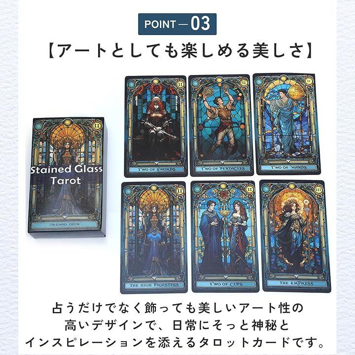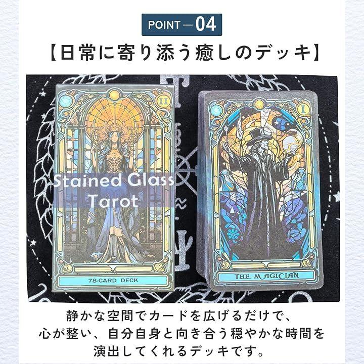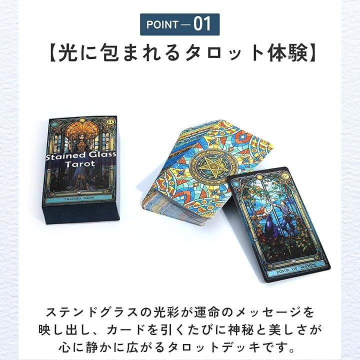 「光に包まれるタロット体験」ステンドグラスの光彩が運命のメッセージを映し出し、カードを引くたびに神秘と美しさが心に静かに広がるタロットデッキです。