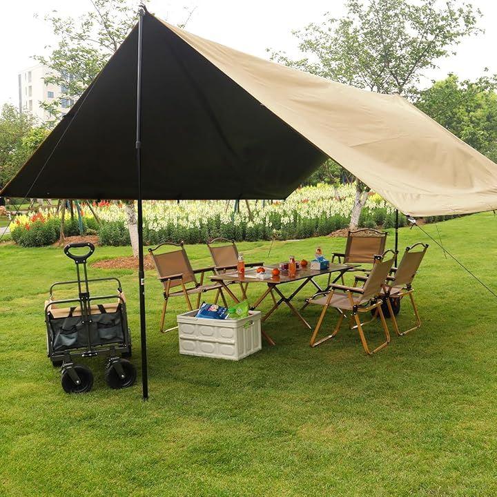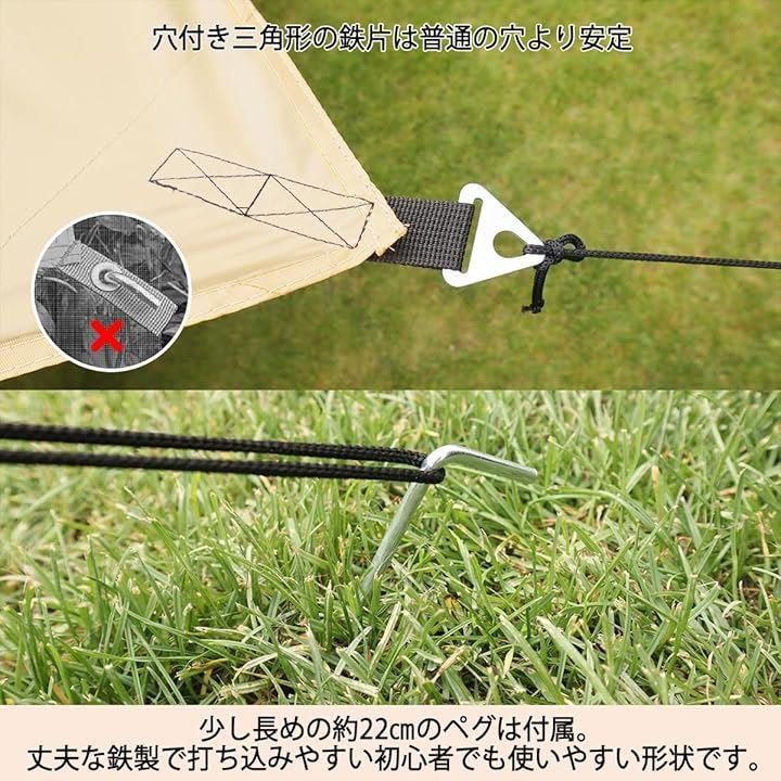 「遮光性が高く」タープは210D高密度のオックスフォード生地で、裏地は遮光性が高く、UVカット効果があるブラックガムコーティングを施していますので、普通のシルバーコーティングより日差しや99.9%紫外線をしっかりとカットでき、遮光性・遮熱性に優れていて真夏にも涼しく快適に過ごせます。