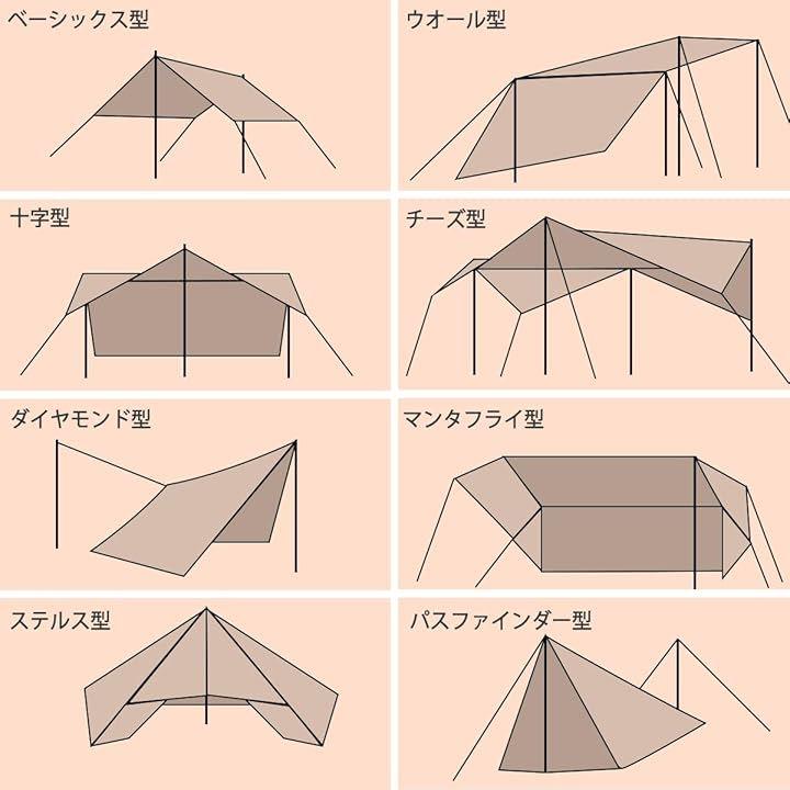 ポールやロープを組み合わせ、天候やシーンに合わせていろいろな張り方が出来ます。