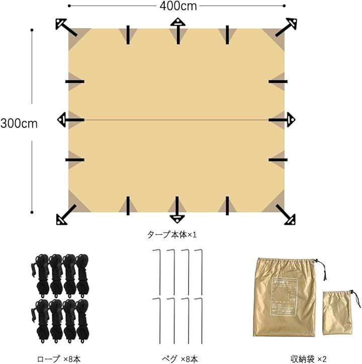 「商品の仕様と付属品」サイズ:300x400cm;収納サイズ:約36x32x4cm;材質:210D高密度のオックスフォード生地+ブラックガムコーティング;カラー: カーキ 内容物:タープ本体x1、ロープx8本、ペグx8本、収納袋x2「ご注意」本製品にポールは付属しません。