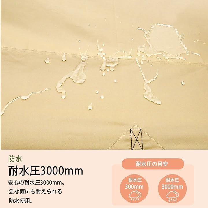 「3000mm耐水圧の防水性」タープは耐水加工で耐水圧3000mm相当です。