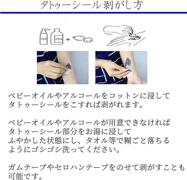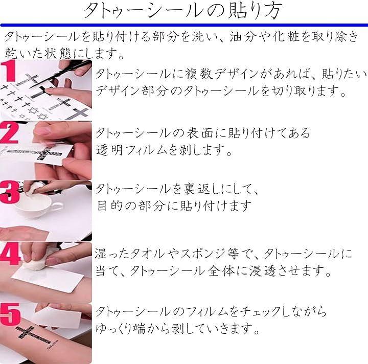 貼り付けたいタトゥーシールを切り取り、表面の透明保護シートを剥がし貼り付けたい箇所の汗や油分と取り除き、絵柄を肌面に触れるように台紙ごとタトゥーシールをのせて軽く押し付けます。