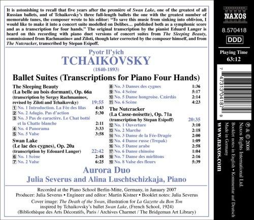 チャイコフスキー(1840-1893)のバレエ音楽は、その美しさと親しみやすさから多くの人によってピアノ連弾版(もしくは2 台ピアノ版)へと姿を変えさせられています。まるで白鳥が美しい娘に変身するように。原曲の持ち味を生かした上で更にデリケートな味わいを見せる各々の曲の何と魅力的なことでしょう!ぴったりと息のあったオーロラ・デュオの見事な演奏でお楽しみください。