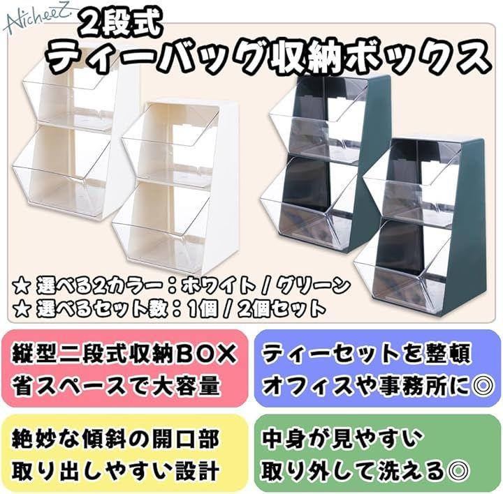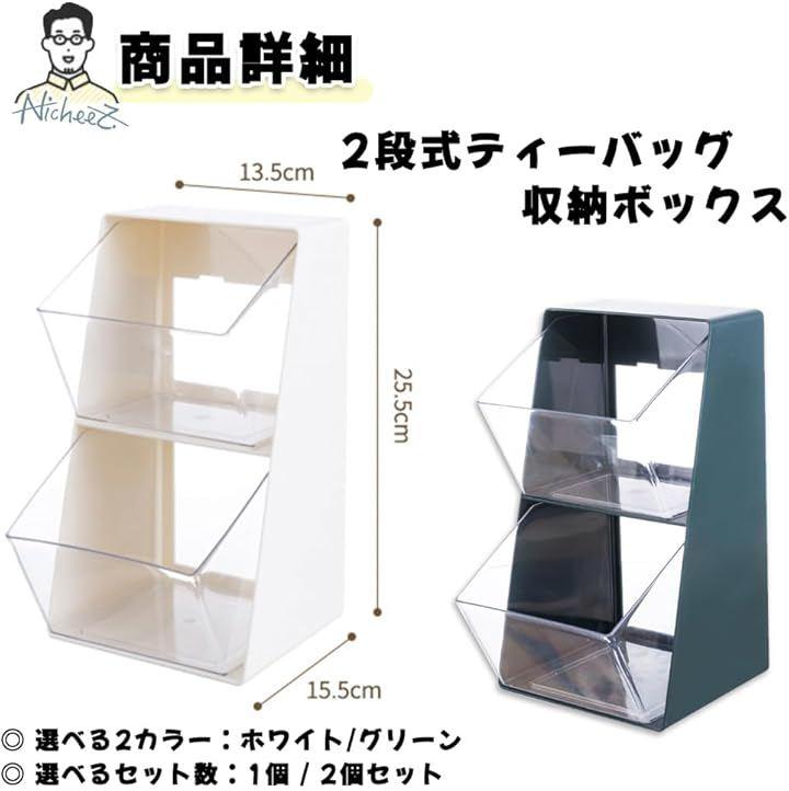 「商品内容」 2段式ティーバッグ収納ボックス セット数:1個/2個セット 材質:プラスチック カラー:オフホワイト/モスグリーン サイズ:幅/約13.5cm 奥行き/約15.5cm 高さ/約25.5cm