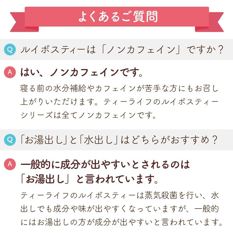 【ティーライフのルイボスティーの特徴】①蒸気製法で成分もお茶の色も出やすいから水出しでも美味しい。②南アフリカ共和国に指定農園ができ産地との連携がさらに強化。③残留農薬検査、水銀検査の実施。④環境に配慮した植物由来のティーバッグ。内容量:1袋202g(2.0gティーバッグ×101個入)原材料(原産国):ルイボス(南アフリカ共和国)、賞味期限:製造日より36ヶ月製造加工地:日本(静岡県)販売累計3,700,000袋突破!愛され続けて10年以上!お召し上がり方:カップにティーバッグ1個を入れて、200ml程度の熱湯を注ぎ3~5分ほどおいてください。飲用し体調や体質により不快感を感じた場合には、ご利用をお控えください。保存方法:チャックをしめ、高温多湿を避け冷暗所にて保存【免責事項】メーカーによる商品リニューアルに伴いパッケージ(内容量も含む)変更が行われた場合、新パッケージでお届け致します事ご了承願います。