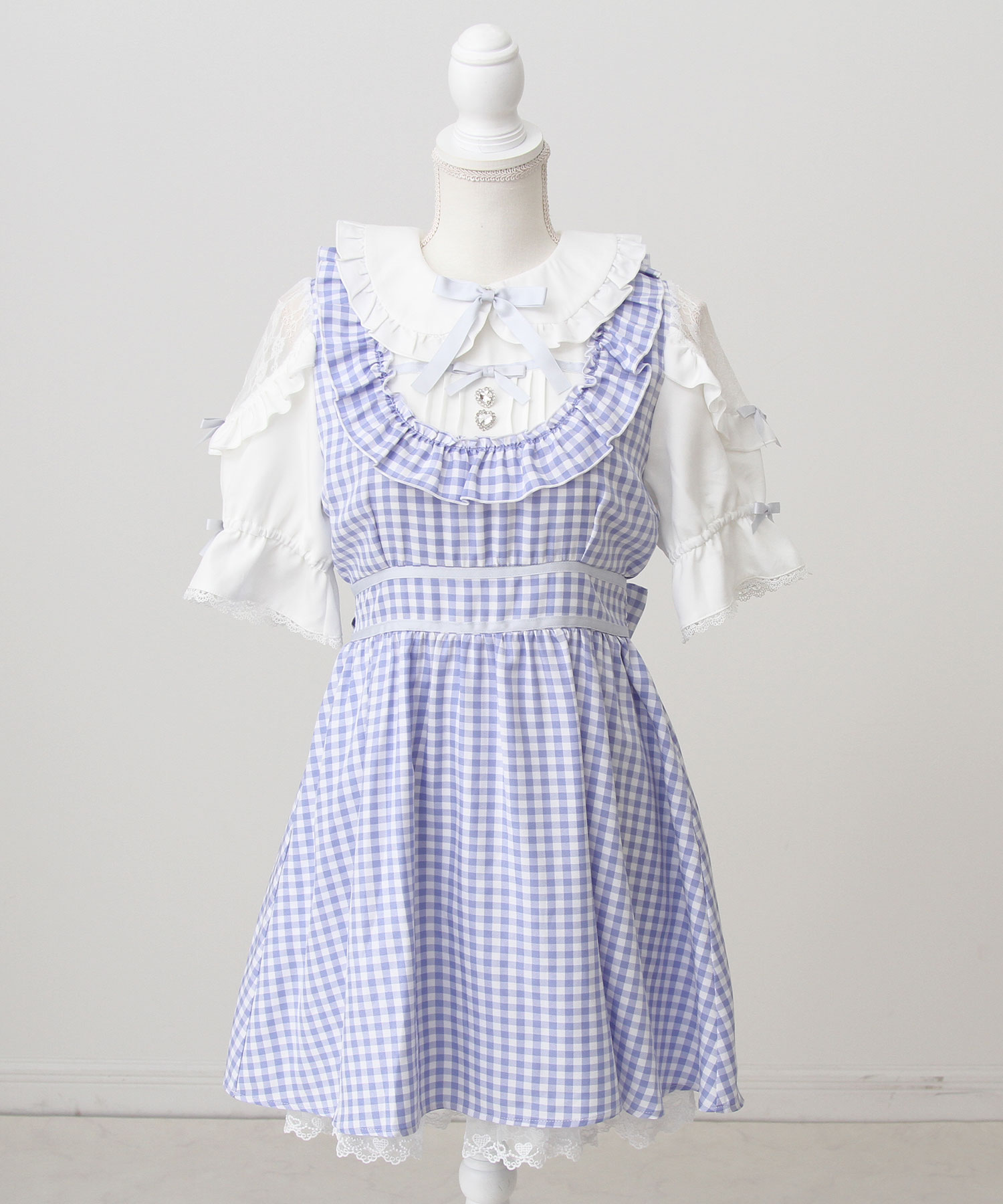 メイドさんのような大きめフリルのヨークデザインがかわいく、リボンいっぱいのワンピースです。