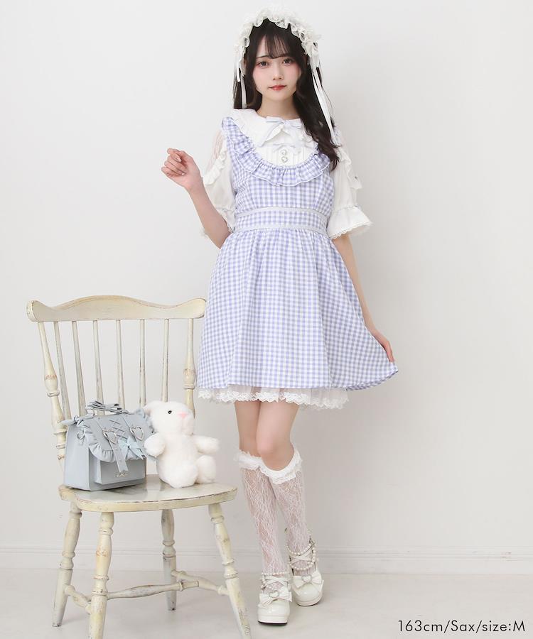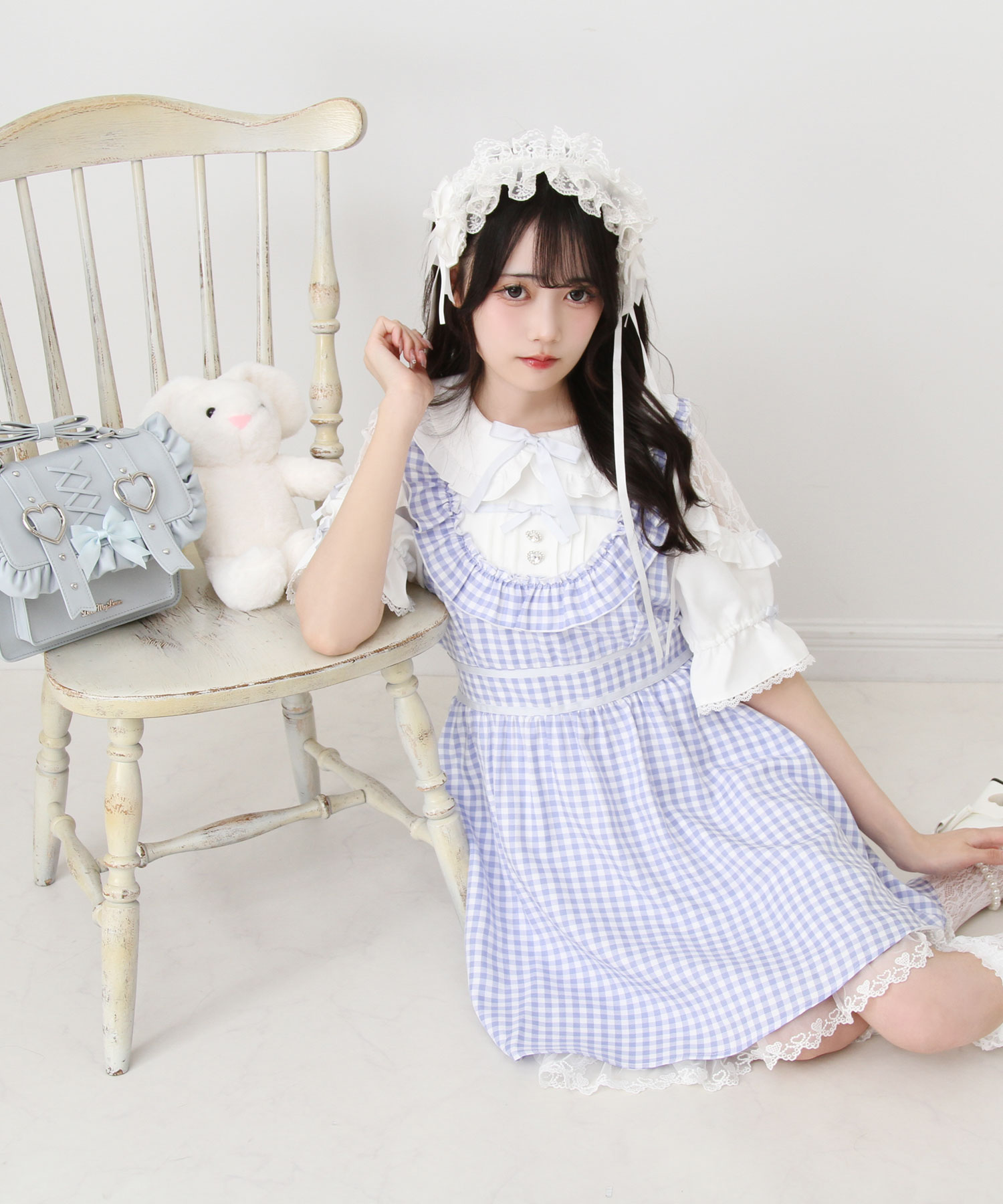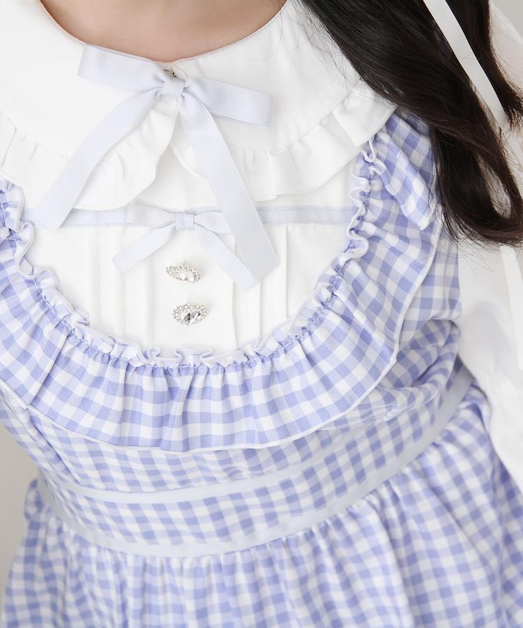 メイドさんのような大きめフリルのヨークデザインがかわいく、リボンいっぱいのワンピースです。