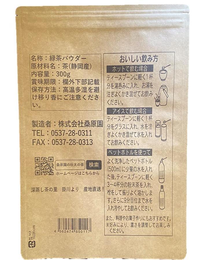 名称:パウダー茶 回転寿司のお茶 原材料名:緑茶 原料原産地名:静岡県産 内容量:300g 販売者:株式会社桑原園 静岡県掛川市上西郷4517 賞味期限は加工時期によって変わりますが約10か月です。召し上がり方 乾いた湯飲みに約1gを入れお湯を300cc注ぎよくかき混ぜてお飲みください。時間が経過しますと湯飲みの底に沈殿しますが茶葉の栄養ですので残さずお飲みください。湯飲みの大きさでパウダーの量とお湯の量を調節してください。●茶葉の栄養素をまるごと 緑茶には体に良いとされる成分が多く含まれています。しかしその多くは水やお湯に溶けない物もある為 茶殻として捨てられてきました。 急須で淹れるお茶は 茶葉の栄養素の約3割ほどしか摂取できません。 緑茶パウダーなら茶葉の栄養素を100%摂取することができます。しかし 実際市販されている緑茶粉末は 栄養素は全部摂れてもあまり美味しくなかったりして 長続きせず 飽きてしまう人も多いのではないでしょうか。【重要】メーカーによる商品リニューアルに伴いパッケージ(内容量も含む)変更が行われた場合、新パッケージでお届け致します事ご了承願います。