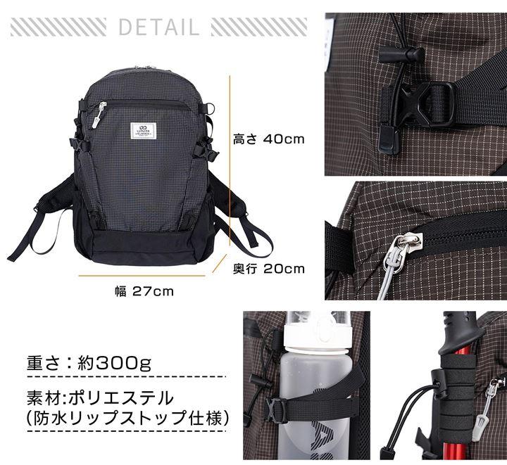 ボトルや傘を収納できるポケットの他、トレッキングポールホルダーやアクセサリーホルダーも完備された本格仕様です。