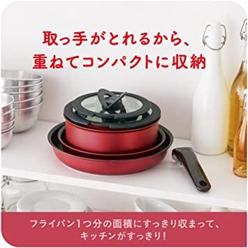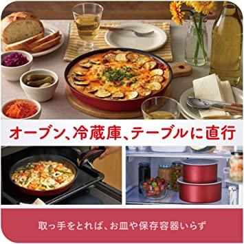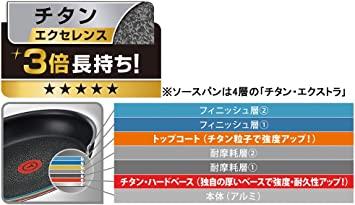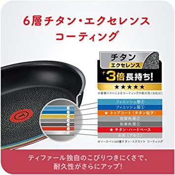 【6層の「チタン・エクセレンス」コーティング】厚くなった「チタン・ハードベース」と、チタン粒子を配合したトップコートによりT-fal史上最高峰の耐久性を実現【温度の見える「お知らせマーク」】マークの模様が消えたら、余熱完了・適温に温まった合図。食材を入れるベストなタイミングが目で見て判る ※ティファールが独自開発したお知らせマーク【片手で付け外しできる専用取っ手】 片手でワンタッチ着脱できるから、調理中の付け替えもスピーディー。「3点固定システム」でしっかりフィットし、ぐらつきをおさえる【平らになってすっきり収納、「バタフライガラスぶた」】 つまみが上下に動いて、パタンと折りたためるバタフライタイプ。調理中の中身が見やすいガラス製。シリコン素材のふちで、お鍋やフライパンにしっかりフィット【取っ手がとれるからコンパクトに収納できて、便利がいっぱい】 取っ手を外してそのままオーブン調理。出来たてをそのままテーブルヘ。お皿への移し替え不要。お手入れ簡単、お皿感覚で丸洗い(フライパン・ソースパンは食洗機対応)