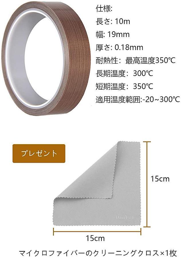 商品仕様種類:テフロンテープ色:茶褐色サイズ:幅19mmx長さ10m厚み(mm):0.18mm重さ(g):54.5g粘着力:9N基材:フッ素樹脂(PTFE)+含浸ガラスクロス粘着剤:シリコーン系
